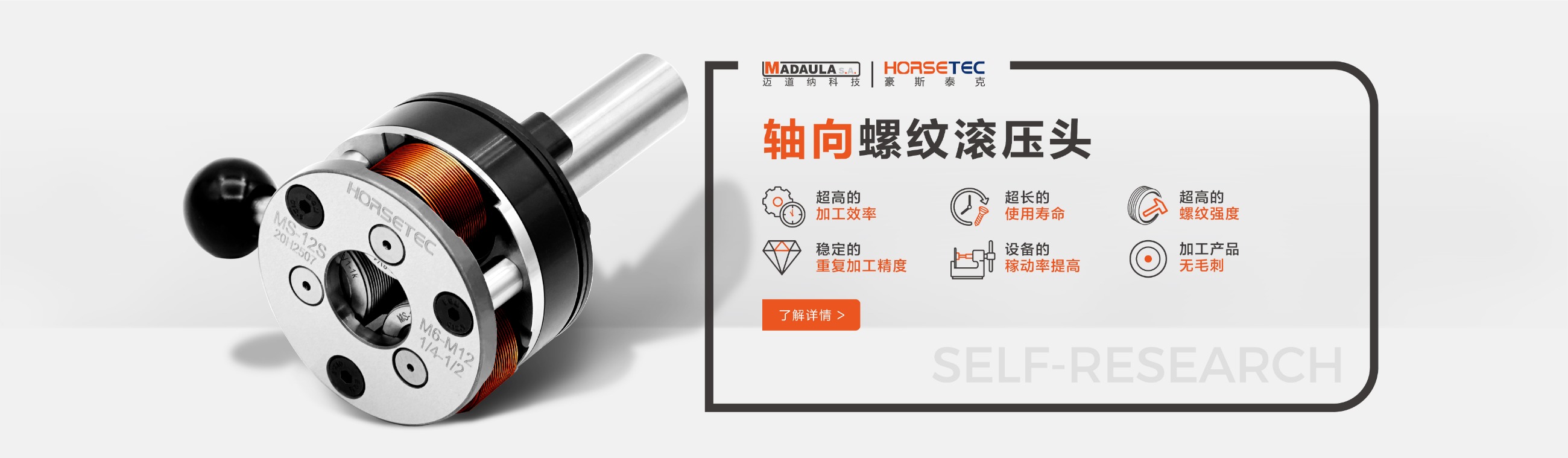 豪斯泰克HORSETEC · 花鍵花紋滾壓頭 有:軸向花紋滾壓頭、徑向花紋滾壓頭、滾花刀等。 -- 滾壓頭替代了單刃刀具加工螺紋效率低、成本高的問(wèn)題,在一次裝夾一個(gè)工序上加工完成,可以減少95%的螺紋加工時(shí)間,降低生產(chǎn)成本。 -- 延伸系數(shù)達(dá)到5%的材料都可以進(jìn)行滾壓加工。 -- 如果在有芯軸支撐的狀況下,薄壁空心零件也可以進(jìn)行滾壓加工。 -- 可用于大多數(shù)類型的機(jī)床:數(shù)控機(jī)床、鉆床、單軸車床、多軸機(jī)床、轉(zhuǎn)盤(pán)式機(jī)床、CNC車床、加工中心、走心機(jī)、專機(jī)及縱切機(jī)床等。